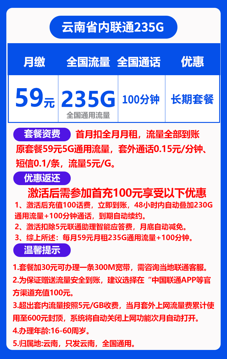专属福利:18-60周岁用户专享,59元月租享235G流量+100分钟通话,年轻就要畅快玩! 产品标题 联通云南省内卡59元包235G通用+100分钟通话 套餐归属 云南 配送方式 快递 开卡方式 快递员上门激活 首充渠道 激活当月任意渠道一次性充值100元 年龄限制 18-60周岁 套餐合约 无合约 违停复机 宣传渠道 禁止包装,禁止信息流,禁止废单 套餐构成 原套餐:原套餐59元5G通用流量,套外通话0.15元/分钟短信0.1/条,流量5元/G.